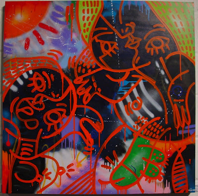 On these canvasses Hunto has used spraypaint almost exclusively, colours are generally flat, bright and blocky with just the occasional fade.
