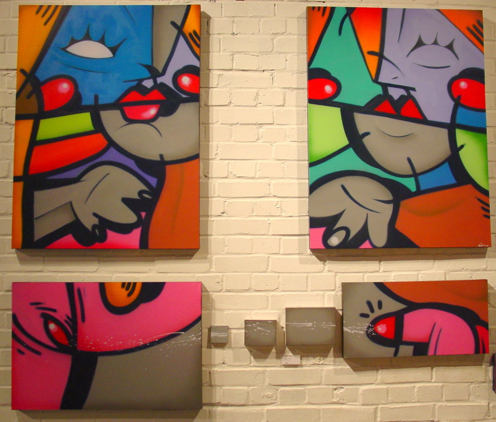 One pair of canvasses stand out for being stylistically different, Hunto adopts a Basquiat style use of scratchy lines to outline the cubist subject which unsurprisingly is what newpaper reports would refer to as “a sex act”, done over a fractal colour layer.