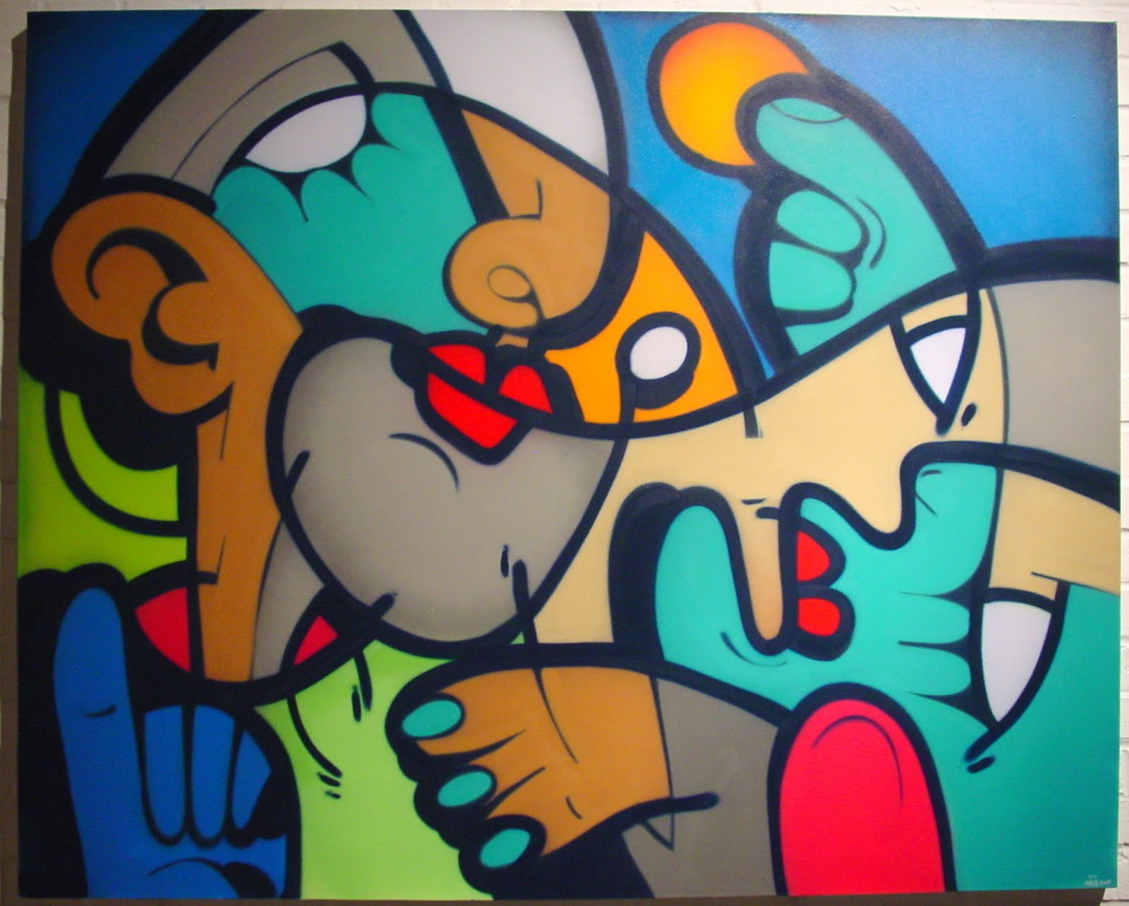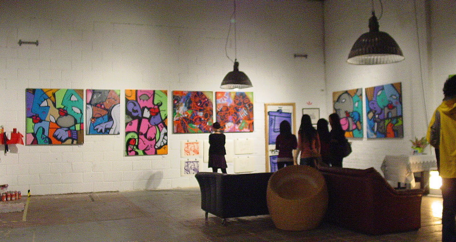 Hunto is showing a collection of canvasses, a mixed media painted-wall-plus-props installation and a beguiling set of screenprinted line drawings. His basic form involves character canvasses in lurid colours, cubist style with views from different angles collapsed onto a single plane (as opposed to intersecting flat planes and shapes).