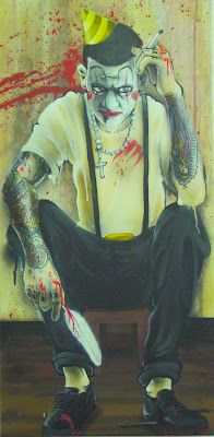 The dominant theme in Sutterby’s canvasses are tattoos, characters with tattoos and straight use of the art of the tattoo. Portraits feature strongly in the collection and nearly all feature tattoos on flesh, tattoo art motifs on clothing and tattoo art in the background. One of the kings of traditional nautical based tattoo art is Sailor Jerry and references to Sailor Jerry appear in several of the works, most notably the Love Thy Neighbour canvas with its sullen and whey faced man with his death heart teeshirt set on a montage of stock Sailor Jerry tattoos.