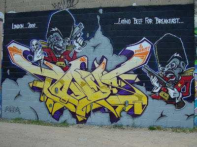 The RT crew are not exactly casuals, winning the 2009 European final of the Write4gold battle in Germany coming top in the tagging, throwie and concept sections (sounds like Final Score at 5 O’clock on a Saturday), Alfa produced the two characters in this Sclater Street piece in April 09