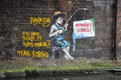 The personal aspect of the Robbo/Banksy handbagging and the merits of the work produced in the feud have really become a sub-plot to the Grafitti vs the whole of creation posture-fest, so lets concentrate just on this second phase of Robbo’s riposte to Banksy. The original Banksy artwork employed street art stylisms to proclaim a message in general about the ubiquity of graffiti tagging and specifically about a society that equates the tag to rubbish fouling the canal. Banksy stencilled a boy fishing a Banksy tag out of the canal. Robbo has turned it around completely and now the fisherman is Banksy, neatly labelled in case there was any doubt and nattily attired in country garms befitting the “bumpkin” slur flung by the capital’s graffiti community (Bumpkin is a term of endearment used by London writers for any writer from the provinces).