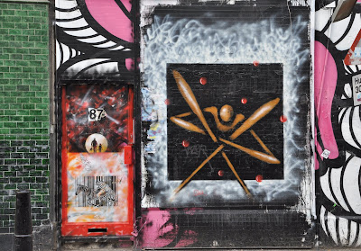 Last week Schade did a new piece on the outside wall at cargo. The fragmented lattice style is there again in the angel/butterfly girl’s wings and the colour scheme the gorgeous contrast effect seen previously on the Old Street and Truman Brewery pieces. The seated figure symbol is there again but there is no obvious link between it and the angel/butterfly girl but obviously being a bit surreal you can’t dismiss the possibility there is some symbolic resonance.