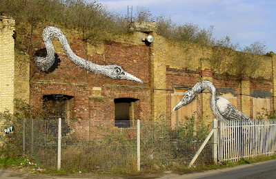 Just as Graffoto was about to hit the upload button, we came across a couple of fresh ROA outdoor rooftop pieces. The roof position looks great, the animals are superbly rendered, the location is iconic but in the case of the full bird the sense of marginalisation and squalor is defeated by the presence of a huge commercial banner making the location as spoilt and derelict as an Ikea showroom.