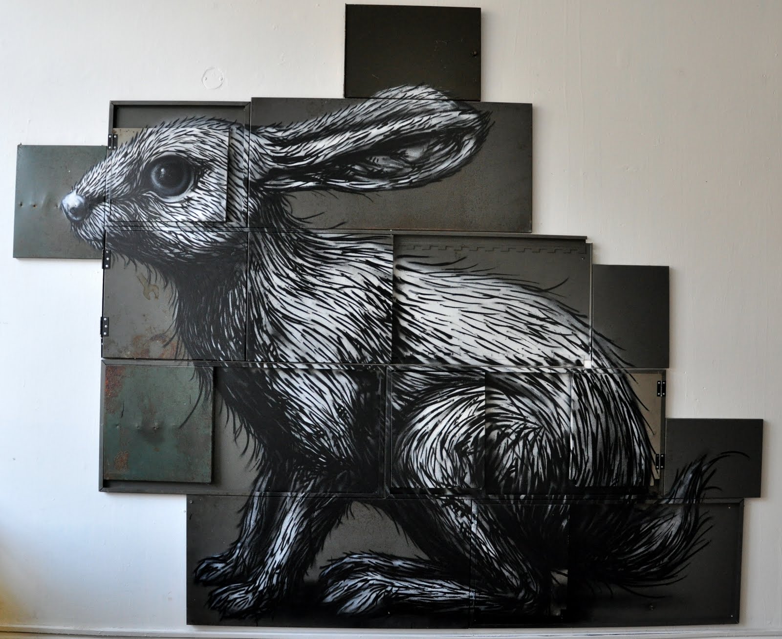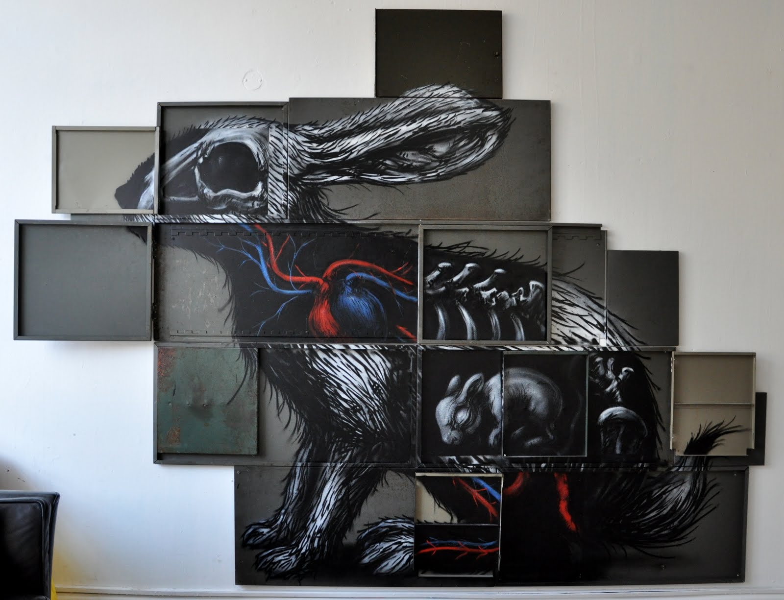 In the gallery Roa remains true to his core themes out on the streets – black and white creatures done in either figurative or cross-section. Most of the metal works have had a previous life as a clothes locker door, such as you might find at work, at school or in the changing room. Being locker doors they come hinged ready open and close and been keen on a bit of the lenticular image which looks different depending upon the viewing angle (like those moving pictures on the front covers of books from your childhood), Roa sets up most of the art to be played with with different images being achieved by opening and closing the doors.