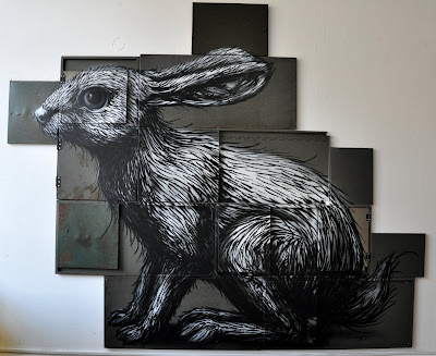 Roa’s pallete is ideal for creating the sense of nature becoming grease-coated with the grime found in man’s no longer wanted former industrial era buildings. He teases our imagination with the alive/dead happy/sad un-resolved ambiguity and depends upon us to anthropomorphologize the creatures to give them their charm. Very little of the stuff displayed on metal is going to fit happily over the fireplace in the average home but curiously there are some conventional sized drawings displayed on the Pure Evil website.