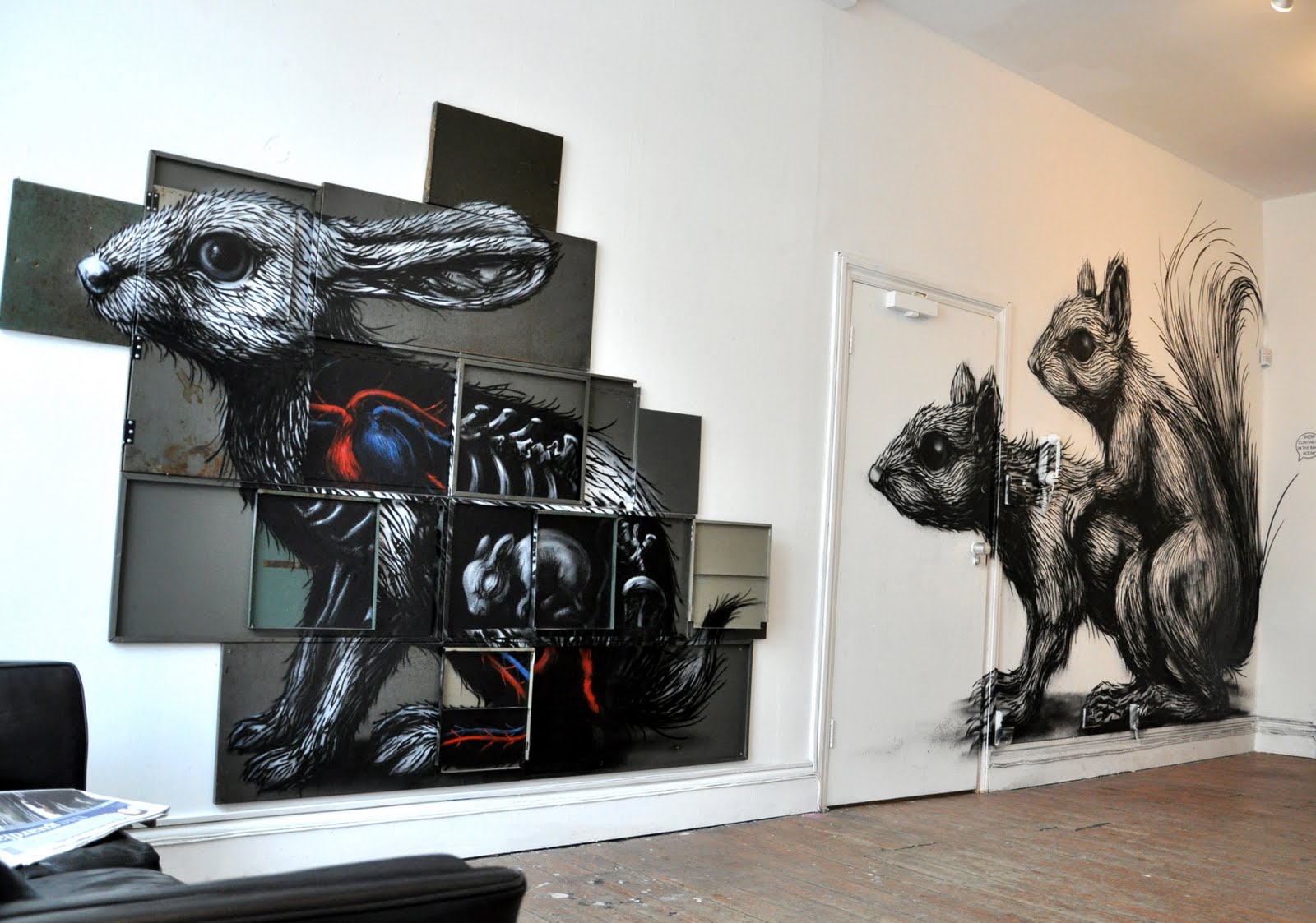 Therein lies the puzzle with Roa’s work, we are inclined to read human emotions and predicaments into the faces and postures of the various animals. It is fairly ridiculous to imagine we can interpret the equivalent “turning Japanese” look of a squirrel on his money strokes, never mind expecting Roa to be painting from intimate knowledge. Yet that’s exactly what we can’t avoid doing. Every Roa piece is squinted at to determine the basics, alive or dead? Hungry and feral or fully fed and bloated? The two horses on the wall in the gallery basement could be piled up spoils of an equine hunt, or two lazy domesticated nags crashed out after a feed.