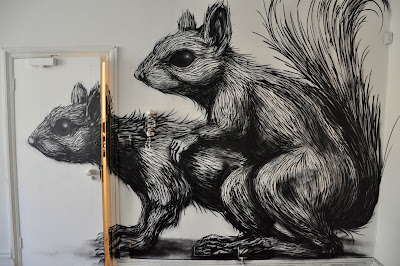 Roa’s work might be described as representing the triumph of animals reclaiming the urban landscape though several of the pieces lead you to suspect some of the critters have come a cropper colliding with man the hunter. The basement installations look a bit like someone has gone a bit mad with the chloroform on Monochrome Farm.