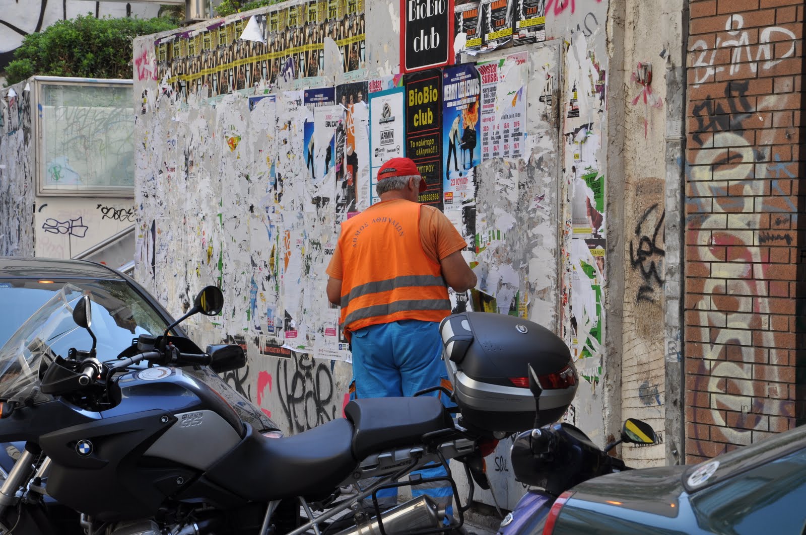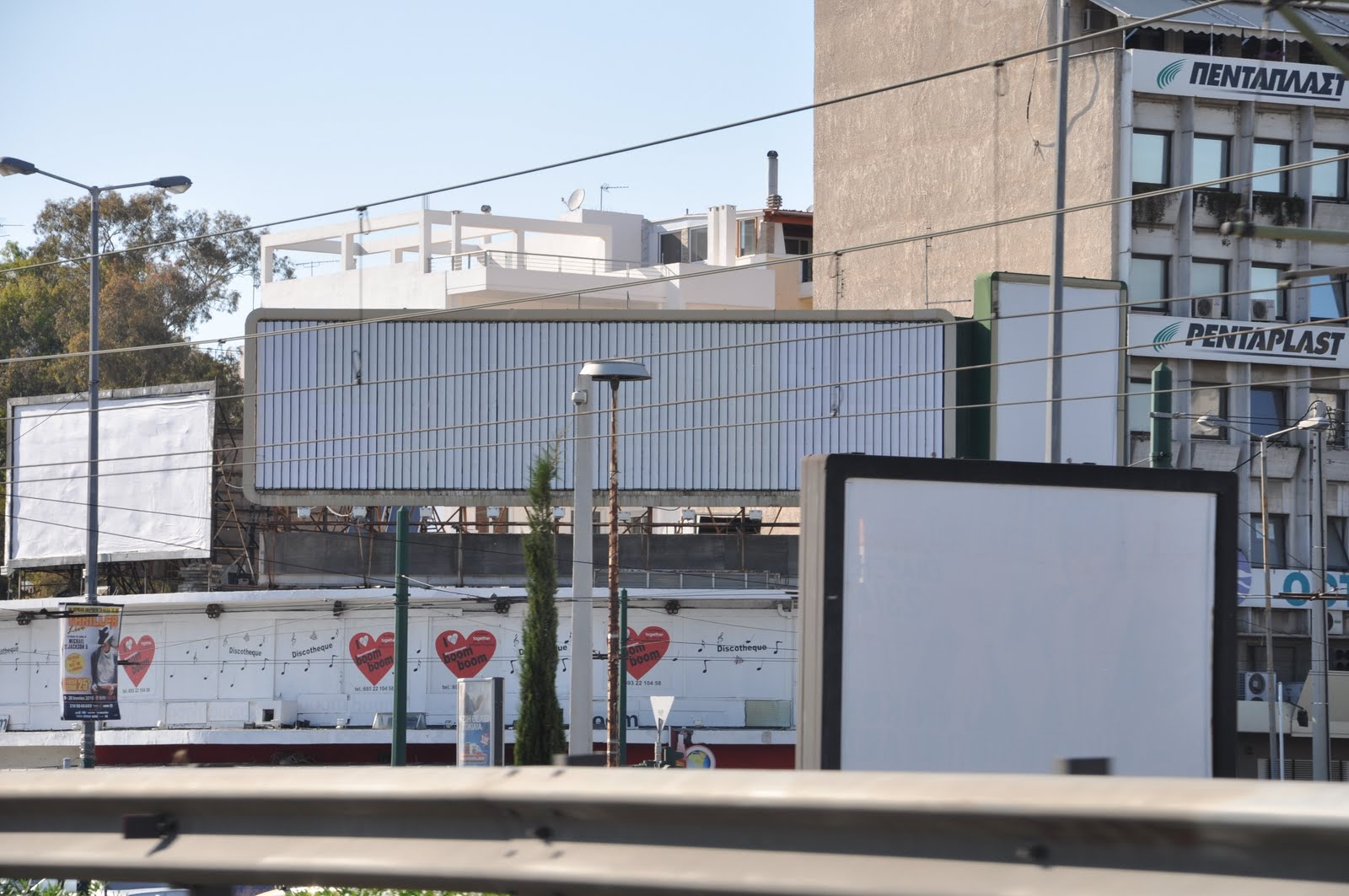 Speaking of the parlous state of the economy, one curious symptom is offered by Athens’ proliferation of legal and illegal road-side advertising. Huge numbers of advertising hoardings across the city have been blanked out, I guess this is the advertisers not having enough paid adverts to cover up old ads when their rented time has expired, no pointing in letting the previous advertisers getting free extensions of their time I suppose. A second theory may be that the authorities are cracking down on illegal un-licensed advertising spots but too many of them looked like flash mechanised rotating jobs that would surely be too expensive to put up un-licensed. Most unlikely to be the work of an Athenian Posterboy copycat.