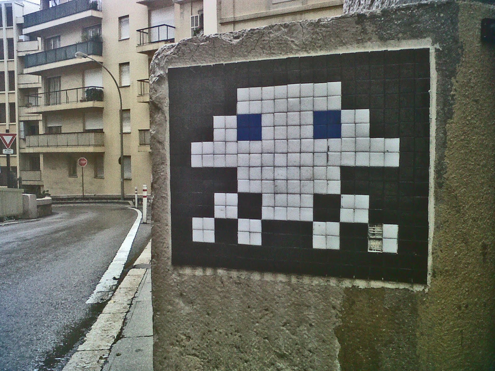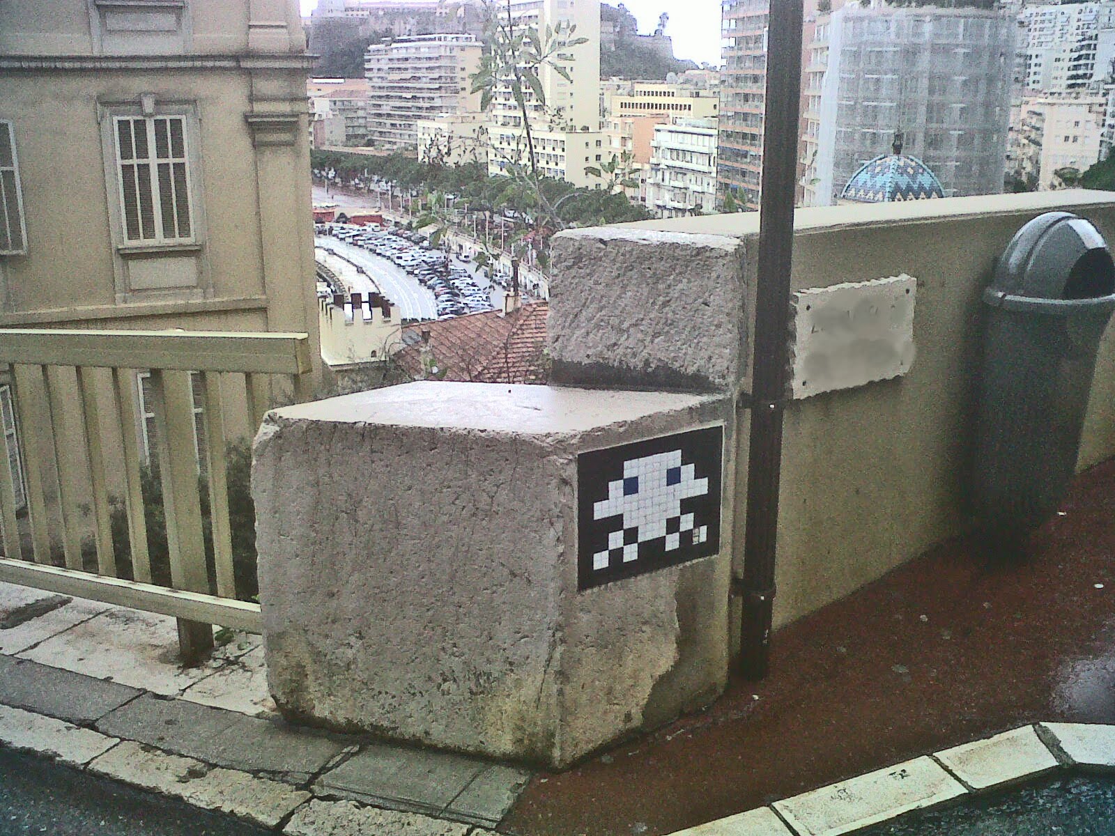Three or four years ago, I can’t recall precisely when, I spotted an Invader mosaic piece from a taxi as we swept through one of the higher back streets of Monaco. I didn’t have a camera on me and there was little sense in going back. On subsequent trips I brought a camera but the chequered Space Invader was no longer to be found at the spot where I thought I had seen it.