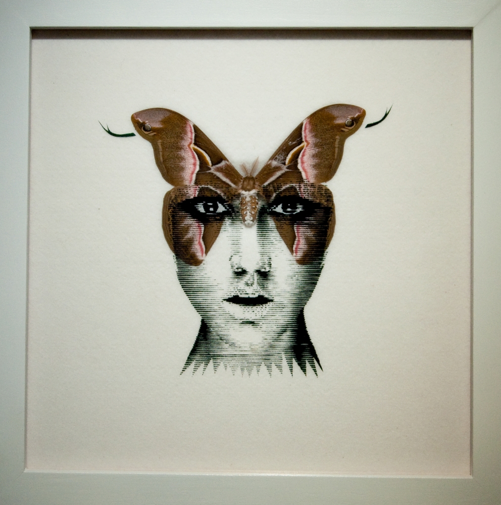 Many people have made an exhibit of themselves with one or two layer stencil images on canvas. The more adventurous throw in a bit ofspraypaint “hand finishing”, or as Banksy’s film showed us, in Brainwash’s case you put them all on the floor and ride your wheelchair around while flicking acrylic in the air. Penny goes the extra distance to embellish the routine stencil image, such as creating a masque’d femme fatal with a stunningly iridescent and REAL butterfly.