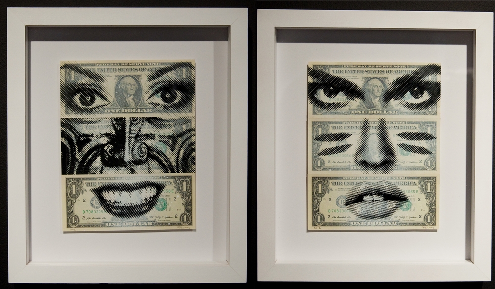 These “Penny Shop Pick and Mix” pieces invited you to select your own personal combination from 5 eyes, noses and mouths on dollar bills to make you own preferred Penny face combo. The idea is that the choice is from an open ended but signed edition for the duration of the show. For a mere £31,250 you could have one of each of the 125 different possible combinations and perhaps the artist could be persuaded to stencil a “CERTIFIED INSANE “ piece as well.