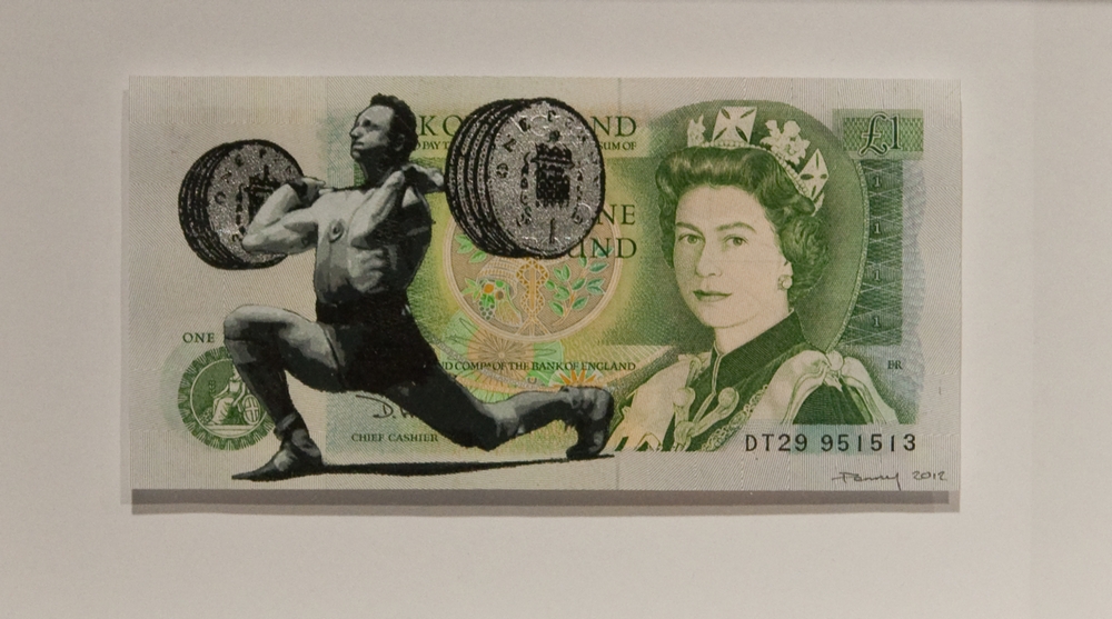If Penny has one trait which might be described as an alignment with Banksy it may be an element of humour in some of the pieces. A lot of the stencils are drawn on the front and reverse of paper currency, old one pound notes and dollar bills and the gag is delivered with the title of the work, including the “Penny Pusher” series in bronze, silver and gold seemingly touching on the Olympic theme dominating the landscape of London this, referencing the huge expense required to stage this sporting fete as Europe tips back into recession and currencies look doomed to fail.