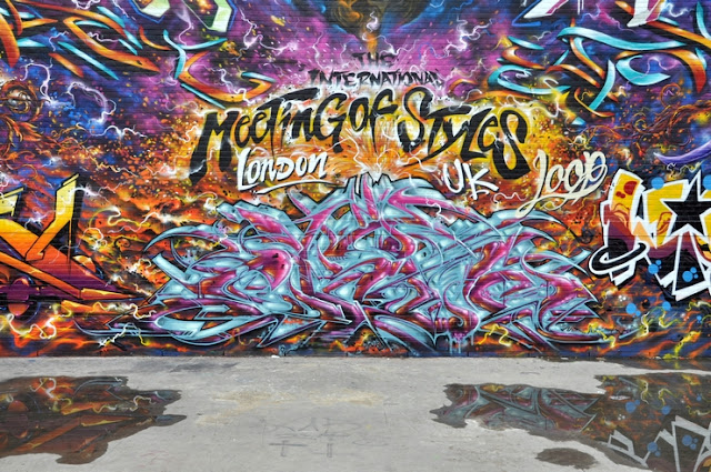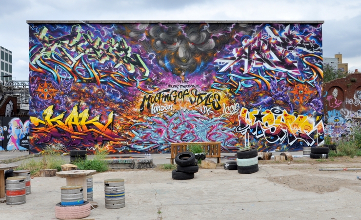 Meeting Of Styles returned to Shoreditch last week for the second Summer on the trot. Over a 2 day period spraycan graffiti writers and street artists from Brazil to Russia via Spain and UK threw a wild ribbon of colour around Shoreditch.